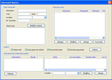 Program de revizii masini. Programul este destinat firmelor de producţie care doresc să aibă o evidenţă clară a pieselor de schimb de pe maşini, astfel încât revizia acestora să se poată face în timp. Aplicaţia funcţionează în reţea, având o parte care rulează sub formă de server pe o staţie, iar utilizatorii se pot conectade pe alte staţii.
